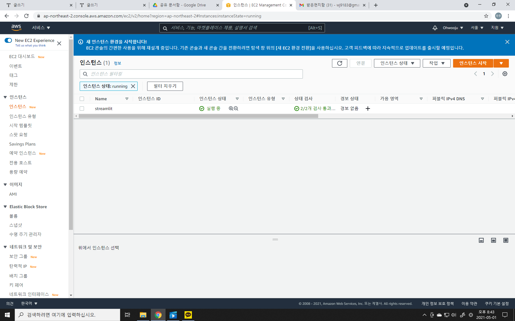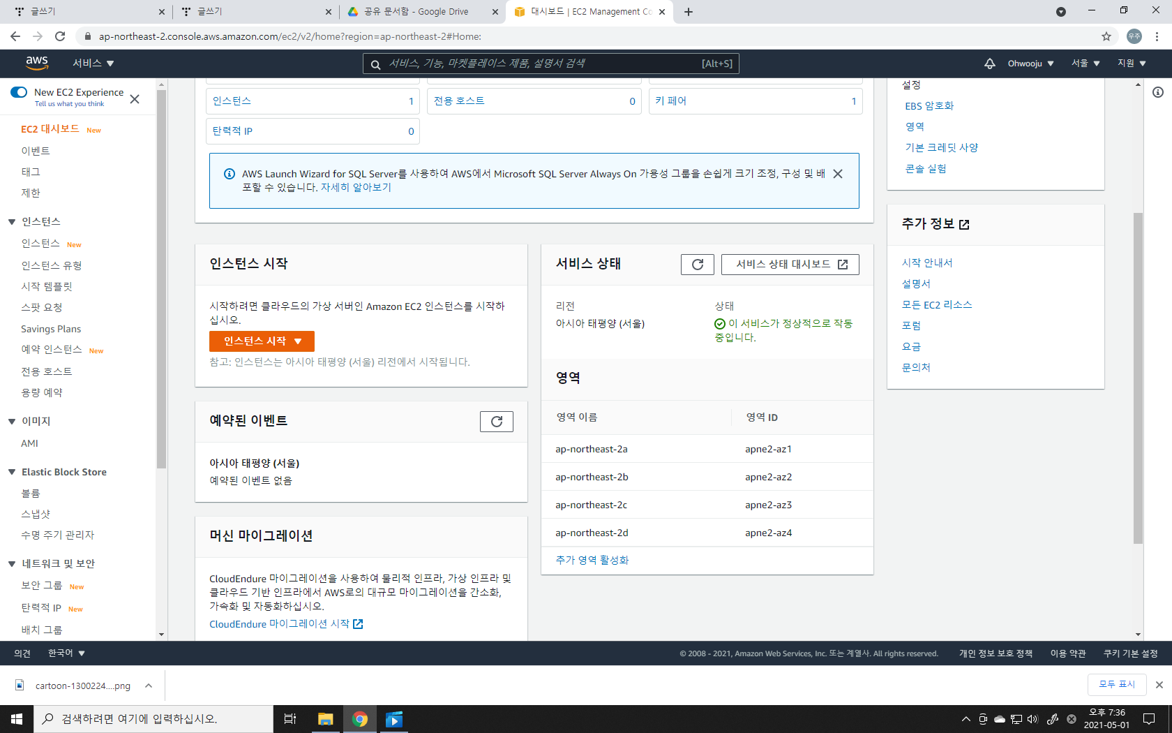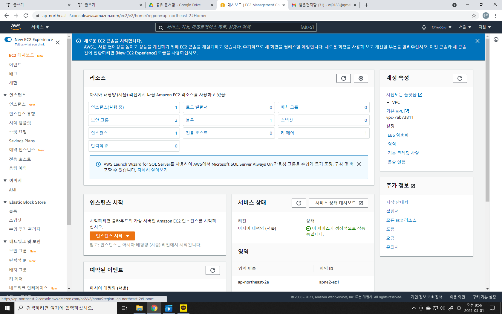 19. 대시보드 메뉴로 돌아와서 인스턴스(실행중)을 눌러준다.