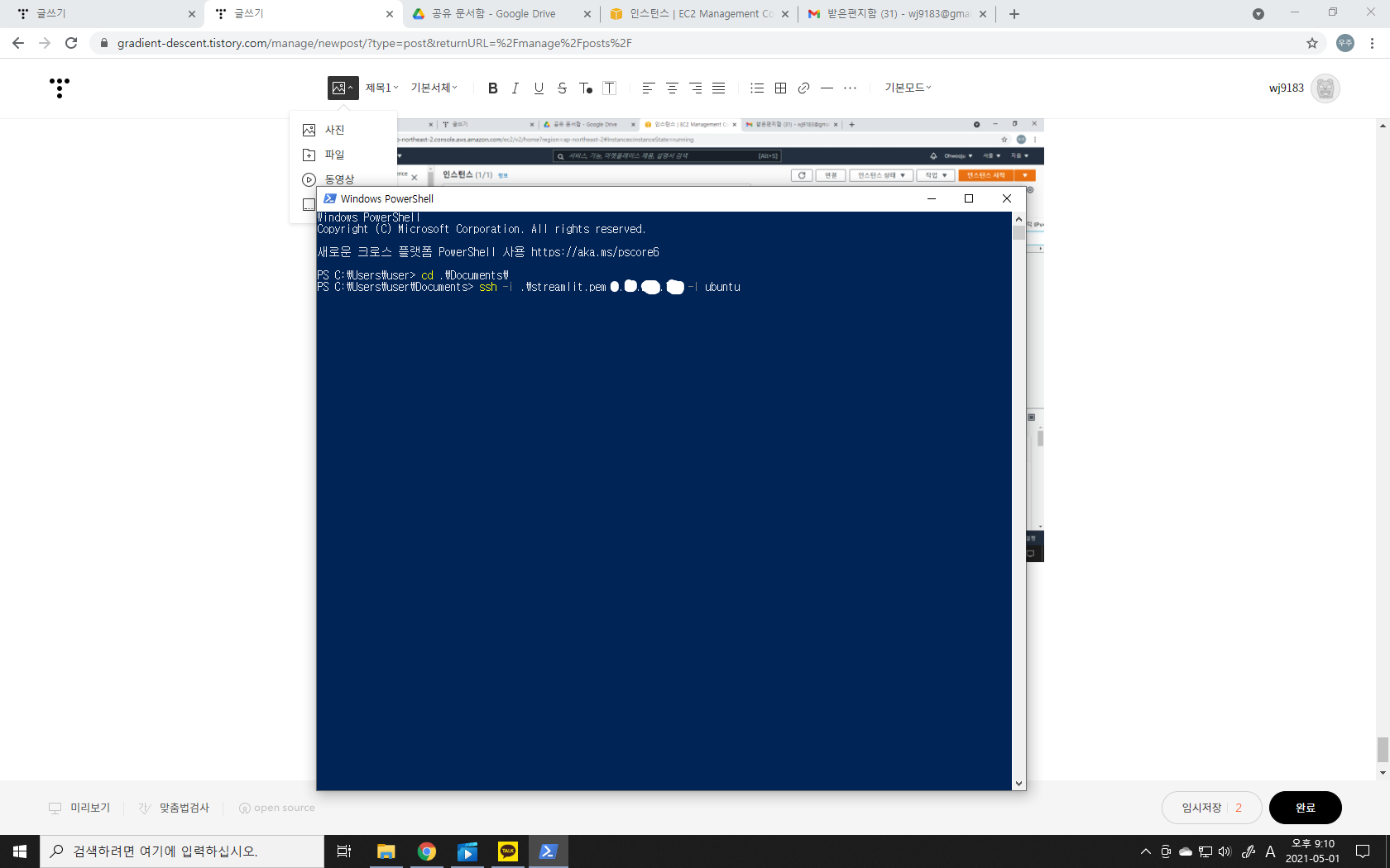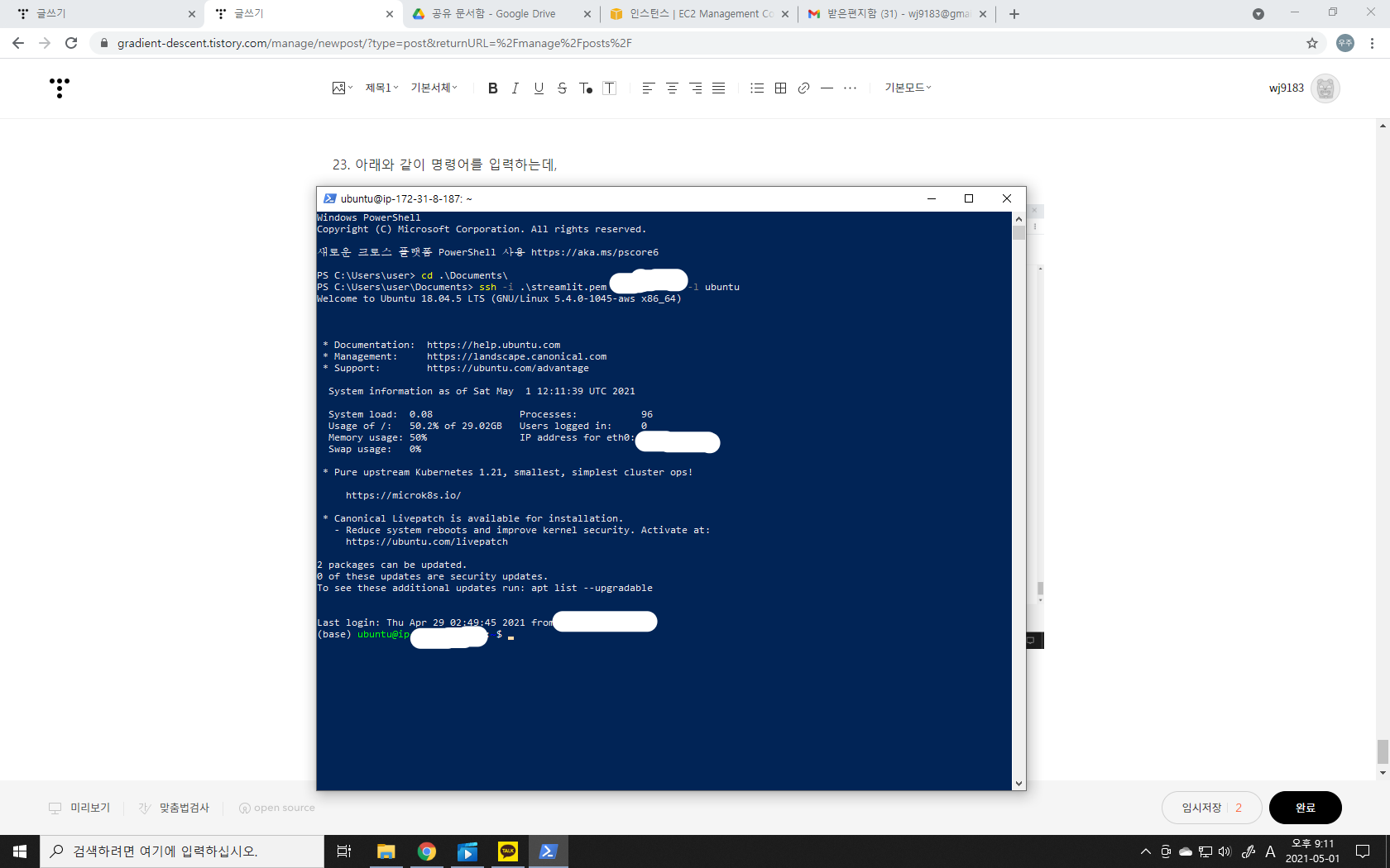 23. 아래와 같이 명령어를 입력하는데, 지워진 부분은 방금 복사해온 퍼블릭 IPv4 주소다.