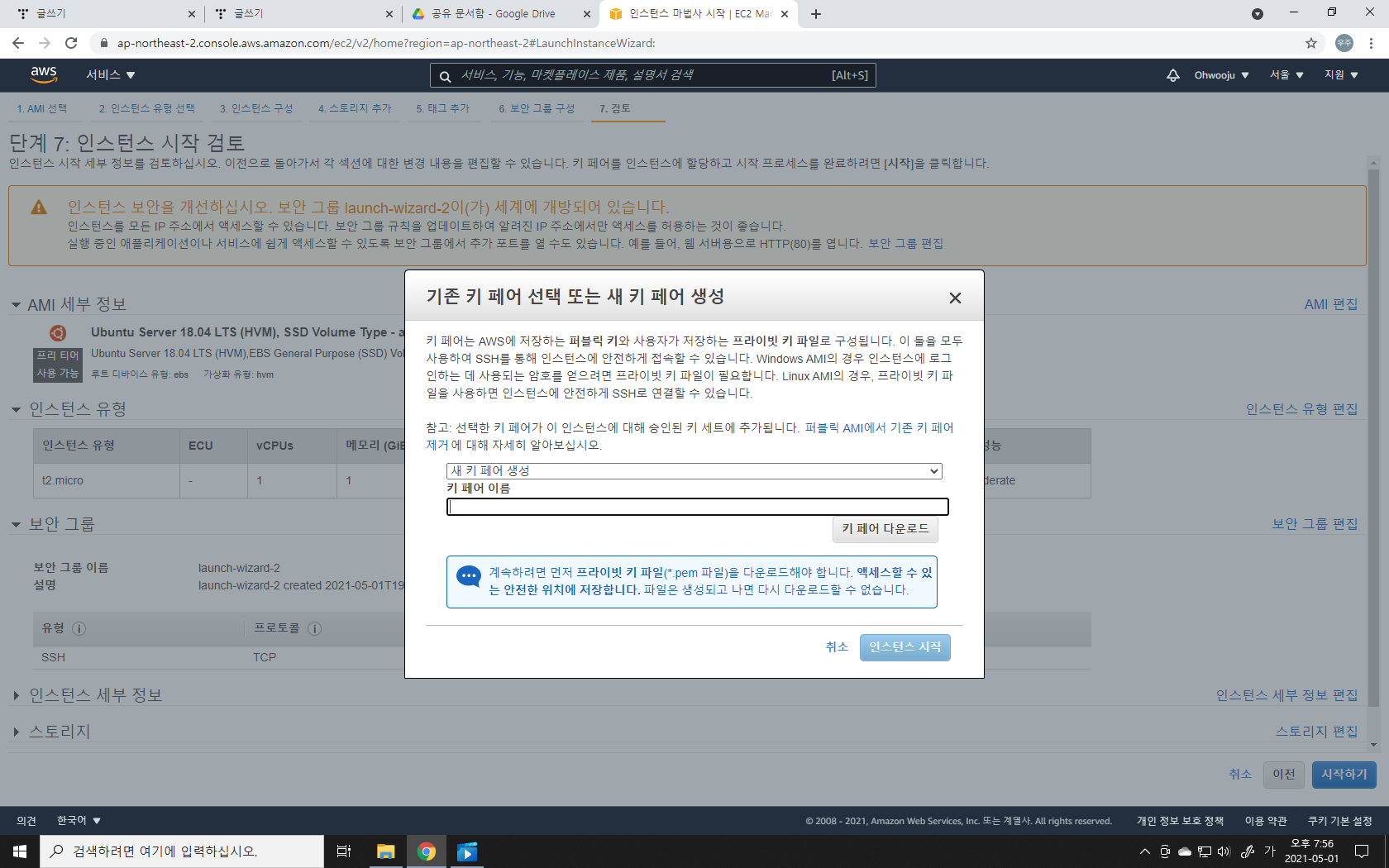 이렇게 나오면, 키 페어의 이름을 정해주고 다운로드 받아서 잘 기억할 수 있는 곳에 넣어둔다.