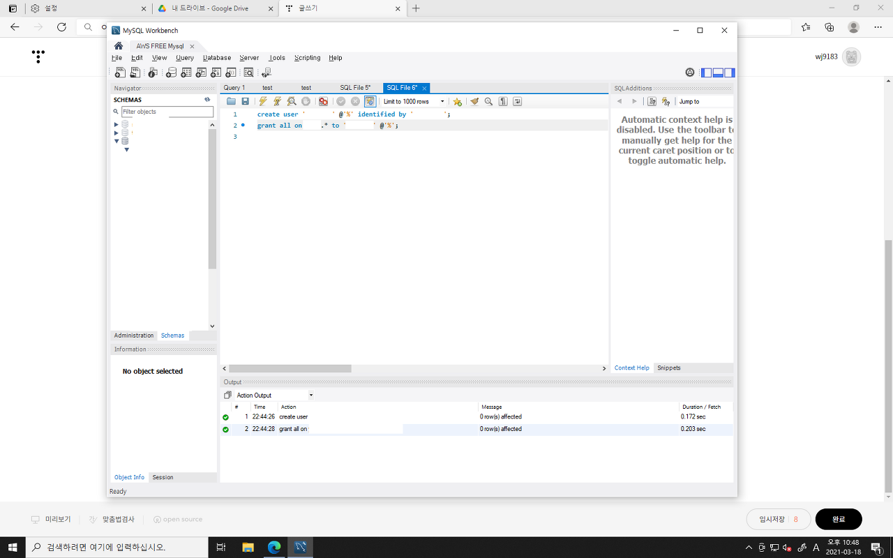 2번째 줄 명령어로 저 아이디에 모든 권한을 준다.