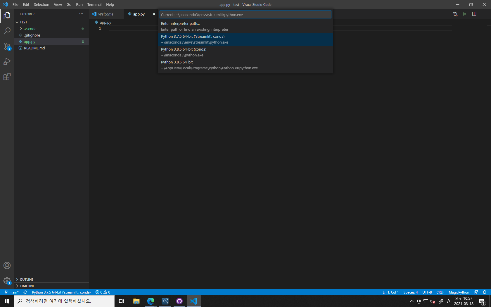 이 글에서는 파이썬으로 데이터베이스 안에 데이터를 활용해서 스트림릿에 올릴 자료를 만들기 위해 사진과 같이 이전에 만들어둔 가상환경을 실행했다.