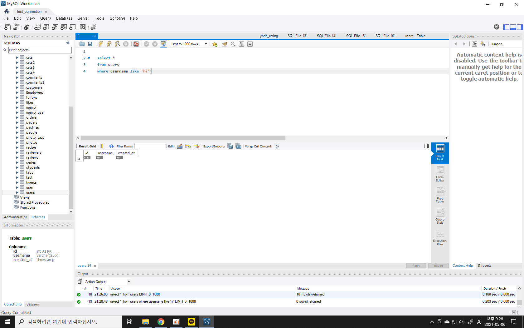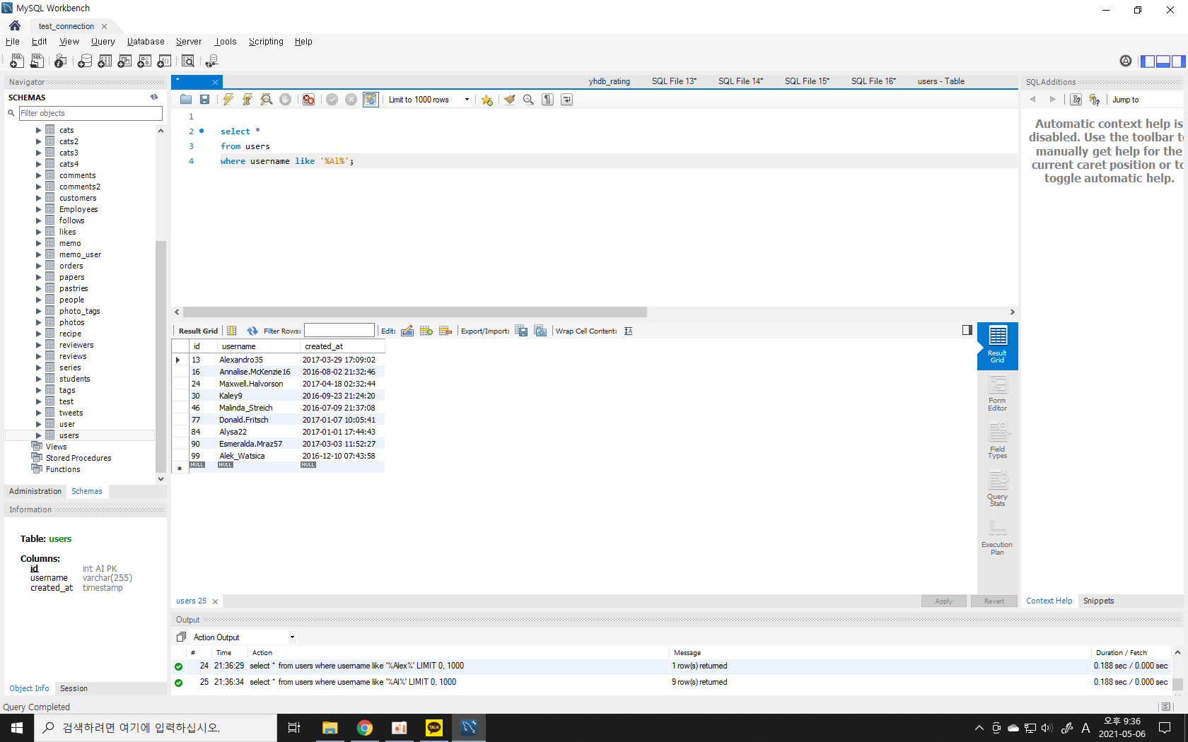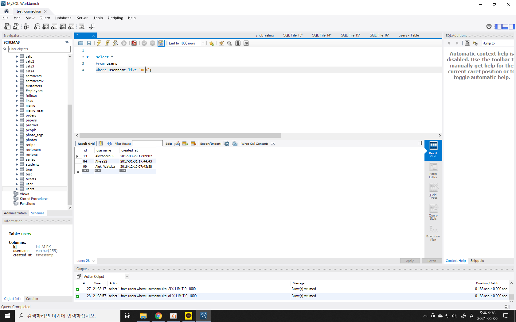 이렇게 사용하면, 앞 뒤에 어떤 다른 문자열이 있든 hi라는 문자열을 포함하는 username은 다 불러온 것이다.