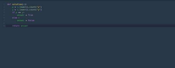 대문자와 소문자가 섞여있는 문자열 s가 주어집니다. s에 'p'의 개수와 'y'의 개수를 비교해 같으면 True, 다르면 False를 return 하는 solution를 완성하세요. 'p', 'y' 모두 하나도 없는 경우는 항상 True를