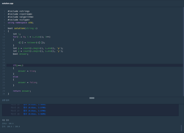 Programmers Coding Test 연습 문제 - 문자열 내 p와 y의 개수 (Python -> C++)
